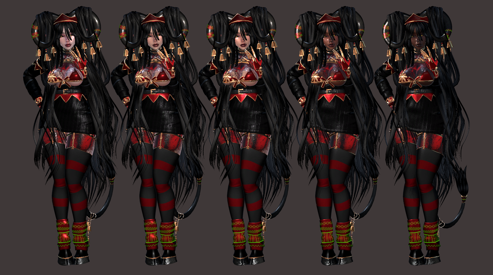 • Top Colour (Red, Black, Green, White) • Shoe Colour (Red, Green, White) • Harness Colour (Black, Green, Red, White) • Bottom Colour (Black, Green, Red, White) • Acc Colour (Red, Black, White) • Skin Colour (Light, Tan, Tanner, Dark, Darker) • Tattoo Tones (Grunge, Snowflakes, Clean) • Hair Colour (Black, Brown, Dark Brown, Rose, Blue, Grey, Red, Light Brown, Grey Brown, White Blonde) • Eye Tones (Goat, Slits, Cross) • Tattoo Tones (Grunge, Snowflakes, Clean)