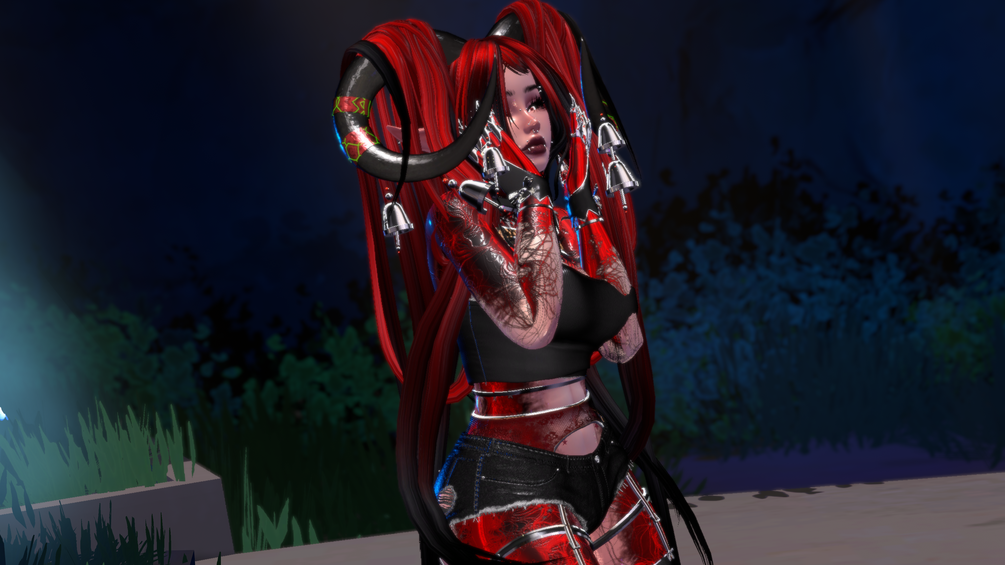 Base: Zinpia • Head, Outfit 1 & 2: Nessy • Horns: DoctorMystic • Hooves: novapie • Tail: Nightshvde • Tattoo 1: kijiio • Tattoo 2: uwublossem • Base & Makeup Texture: Jvliette • Hair 1: V3N1X • Hair 2: Vampi • Hair 3: Saikura • Hair Textures: cicieaaavr • Earrings: Skulli • Sweater Dress: Sezzy • Nails: Zenifyy • Claws: Vinuzhka • Shorts: Yuutsu • Tank Top: Enkeli • Eyes: therealthiccwitch • Candy Cane/Sword: Makarov • Kpop Poof: Phawksea • Custom Sword Particle: MedicE • Better Gestures: Kiriecho • Wholesome setup: Wholesome • Matcap: Shugan • Gogo Loco: Franda • Everything else by me